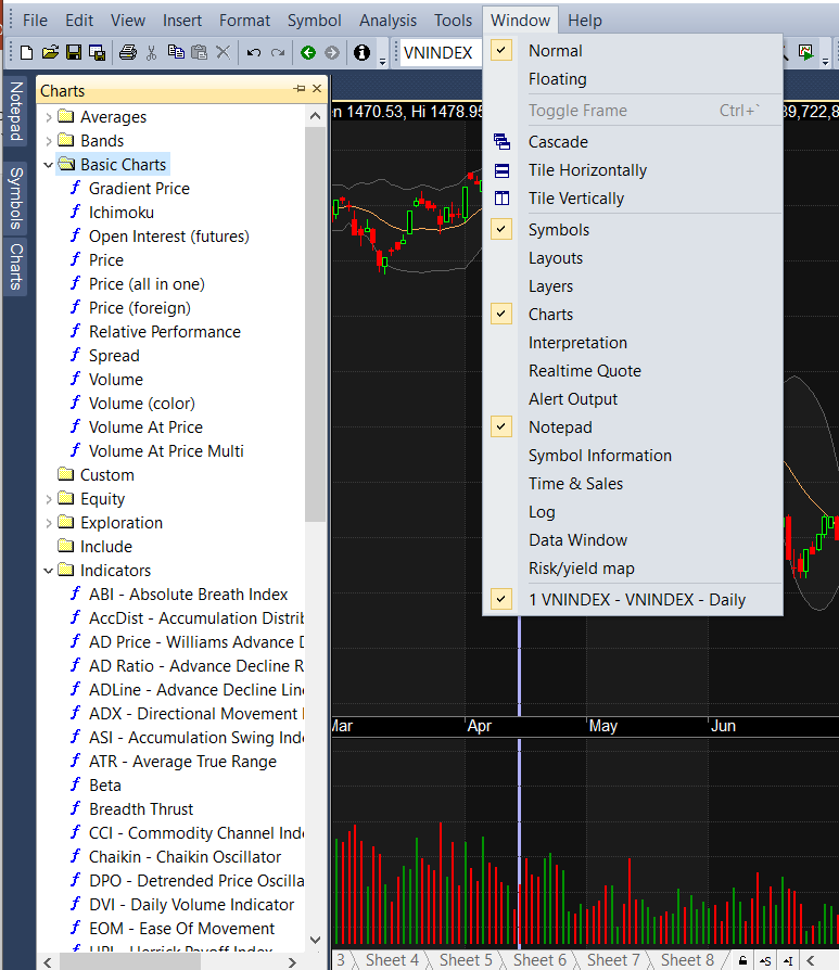 Chúng ta có thể thêm các biểu đồ (chart), dựng các mẫu(layout)... bằng cách vào Window -> tick chọn Charts và Symbols