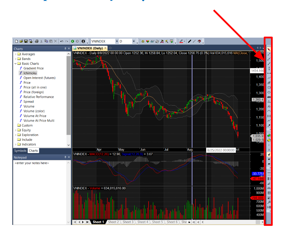 Các thanh công cụ bên phải màn hình, giúp nhà đầu tư ghi chú, thêm các phân tích vào biểu đồ, các thao tác cơ bản như sau:
