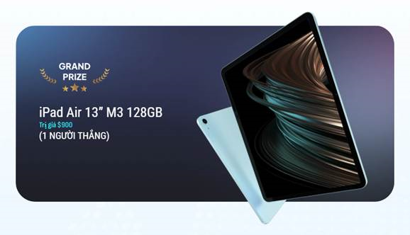 - Giải Nhất (Grand Prize): 1 iPad Air 13" M3 128GB trị giá $900.