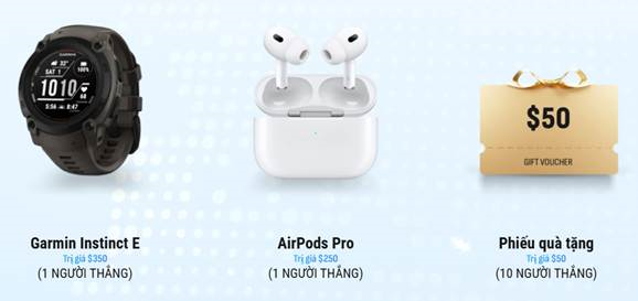 - Các giải thưởng giá trị khác: 1 đồng hồ thông minh Garmin Instinct E, 1 tai nghe AirPods Pro, và 10 Phiếu quà tặng trị giá $50 mỗi phiếu.