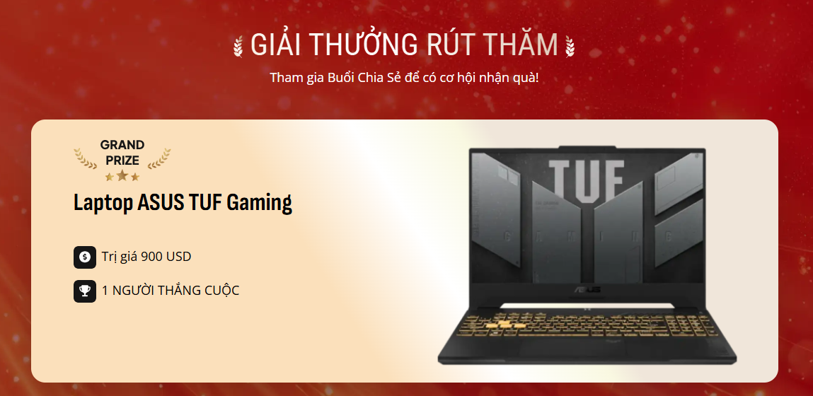 - 01 GIẢI NHẤT: Laptop ASUS TUF Gaming (Trị giá $900) – Cấu hình mạnh mẽ, khớp lệnh siêu mượt.