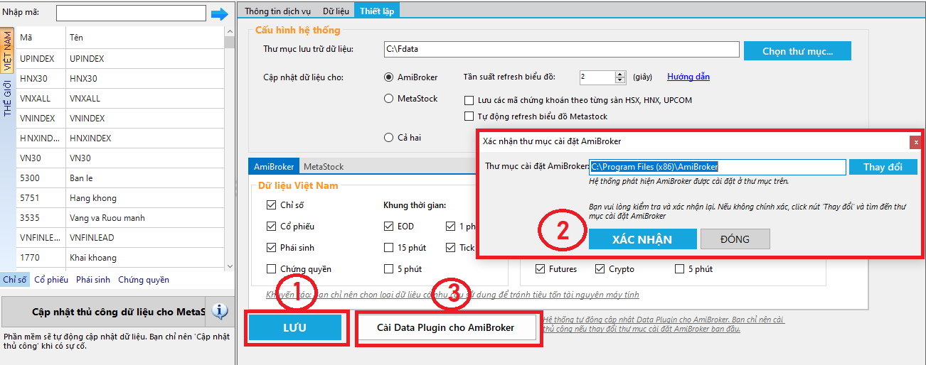 Bước 4: Click vào “Cài Data Plugin cho Amibroker” sau đó sẽ hiển thị ra hộp thoại “Xác nhận thư mục cài đặt Amibroker“, Nhà đầu tư click vào “Thay đổi” nếu cài Amibroker ở bước trên vào ổ khác. Còn theo bước cài đặt ở trên chúng tôi cài Amibroker vào “C:\Program Files (x86)\AmiBroker“, do vậy đường dẫn cài Plugin mặc định vẫn là “C:\Program Files (x86)\AmiBroker“. Click “Xác Nhận” để hoàn tất.