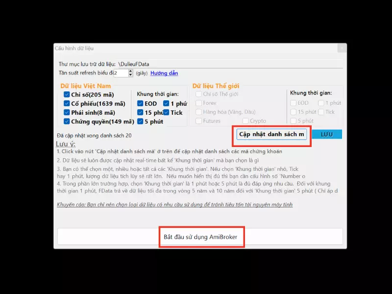 Bước 11: Click vào “Cập nhật danh sách mã“, bước tiếp theo click vào “Bắt đầu sử dụng Amibroker“. Sau đó click “OK” để hoàn tất cài dữ liệu Fdata EOD.