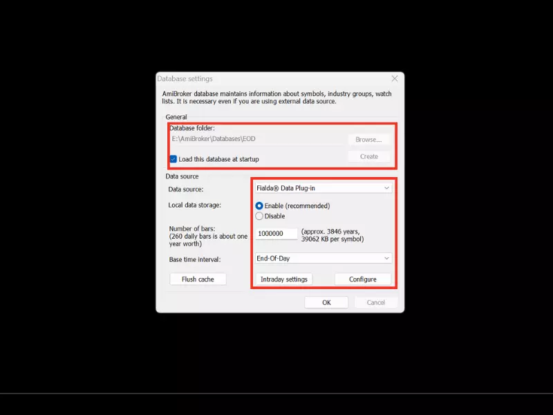 Bước 7: Ở mục “Database folder“, phần đuôi có chữ “MyNewData” Nhà đầu tư cần đổi tên để tránh trùng lặp database đã tạo trước đó, có thể đặt bất kỳ tên gì cũng được ví dụ: “C:\Program Files (x86)\AmiBroker\MyNewData” đổi thành “C:\Program Files (x86)\AmiBroker\EOD“.