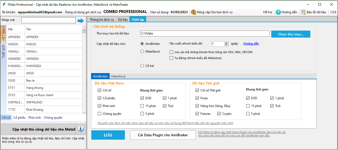 Bước 3: Phần “Cập nhật dữ liệu cho” Nhà đầu tư dùng phần mềm nào thì tick vào đó, hoặc có thể tick cả hai. Tôi đang hướng dẫn cài dữ liệu chứng khoán Fialda cho Amibroker, do vậy tôi sẽ tick vào Amibroker.