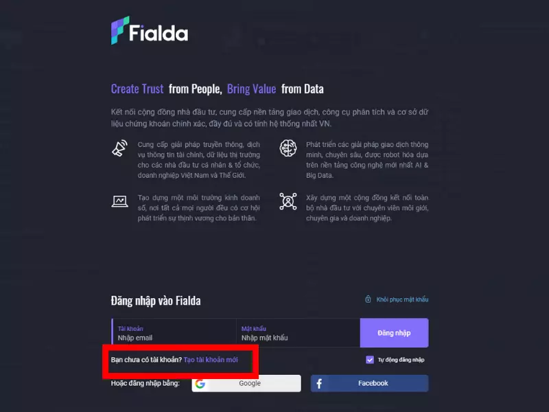 Bạn sử dụng tài khoản Fialda để đăng nhập vào Fdata. Nếu chưa có tài khoản nhà đầu tư chọn phần “Bạn chưa có tài khoản? Tạo tài khoản mới” Click vào đó để tiến hành đăng ký tài khoản Fdata.
