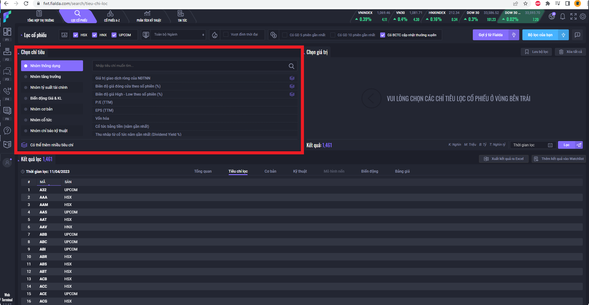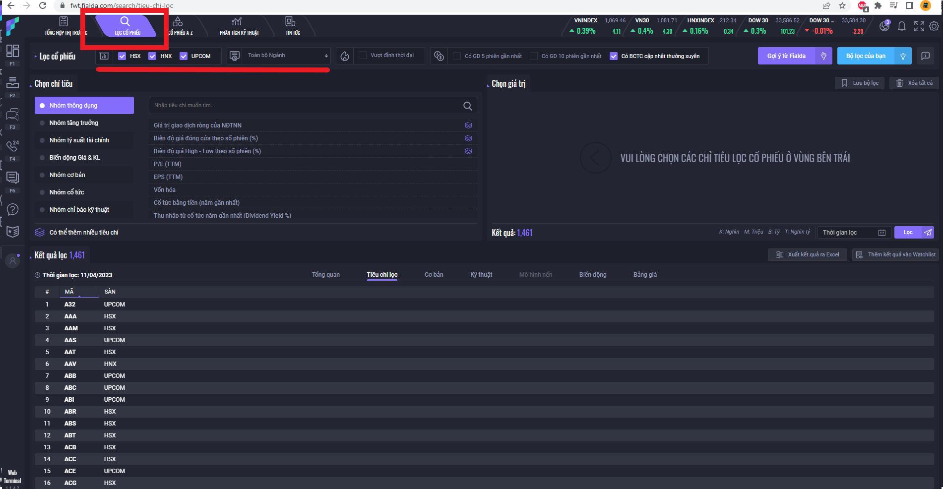 Tại màn hình trang chủ của Fialda chúng ta chọn phần LỌC CỔ PHIẾU