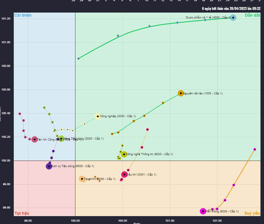 Đồ thị Relative Rotation Graph (RRG) là một công cụ trực quan hóa để phân tích Sức mạnh tương đối (Relative Strength – RS). Với cơ chế luân chuyển của dòng tiền theo chu kỳ, RRG giúp nhà đầu tư tìm hiểu được những tài sản mạnh nhất trên thị trường, hoặc là sắp sửa mạnh nhất so với 1 mốc (thường là các chỉ số thị trường) hoặc so với chính nó. Nhìn chung, dòng tiền sẽ vận động theo 1 chu kỳ gồm 4 giai đoạn, giống với 4 mùa trong năm.