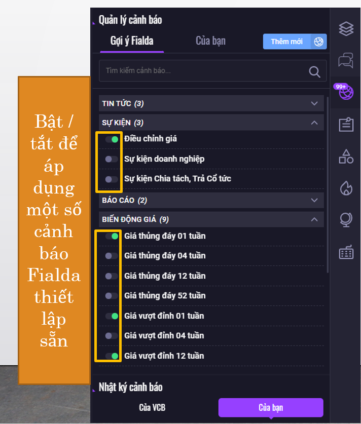 Quản lý Cảnh báo - “Gợi ý Fialda” : là một số cảnh báo được Fialda thiết lập sẵn để người dùng lựa chọn áp dụng (cho mã cổ phiếu đang mở xem đồ thị kỹ thuật).