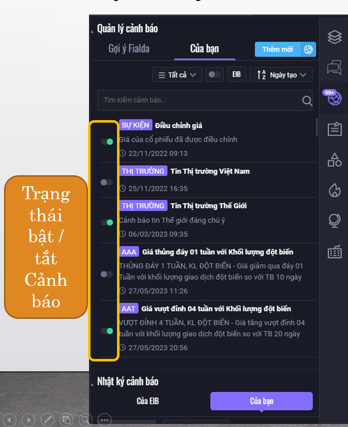 Quản lý cảnh báo - “Của bạn” : giúp người dùng theo dõi các cảnh báo đã tạo và quản lý trạng thái (bật / tắt) hay mở cửa sổ chỉnh sửa thiết lập cho cảnh báo.