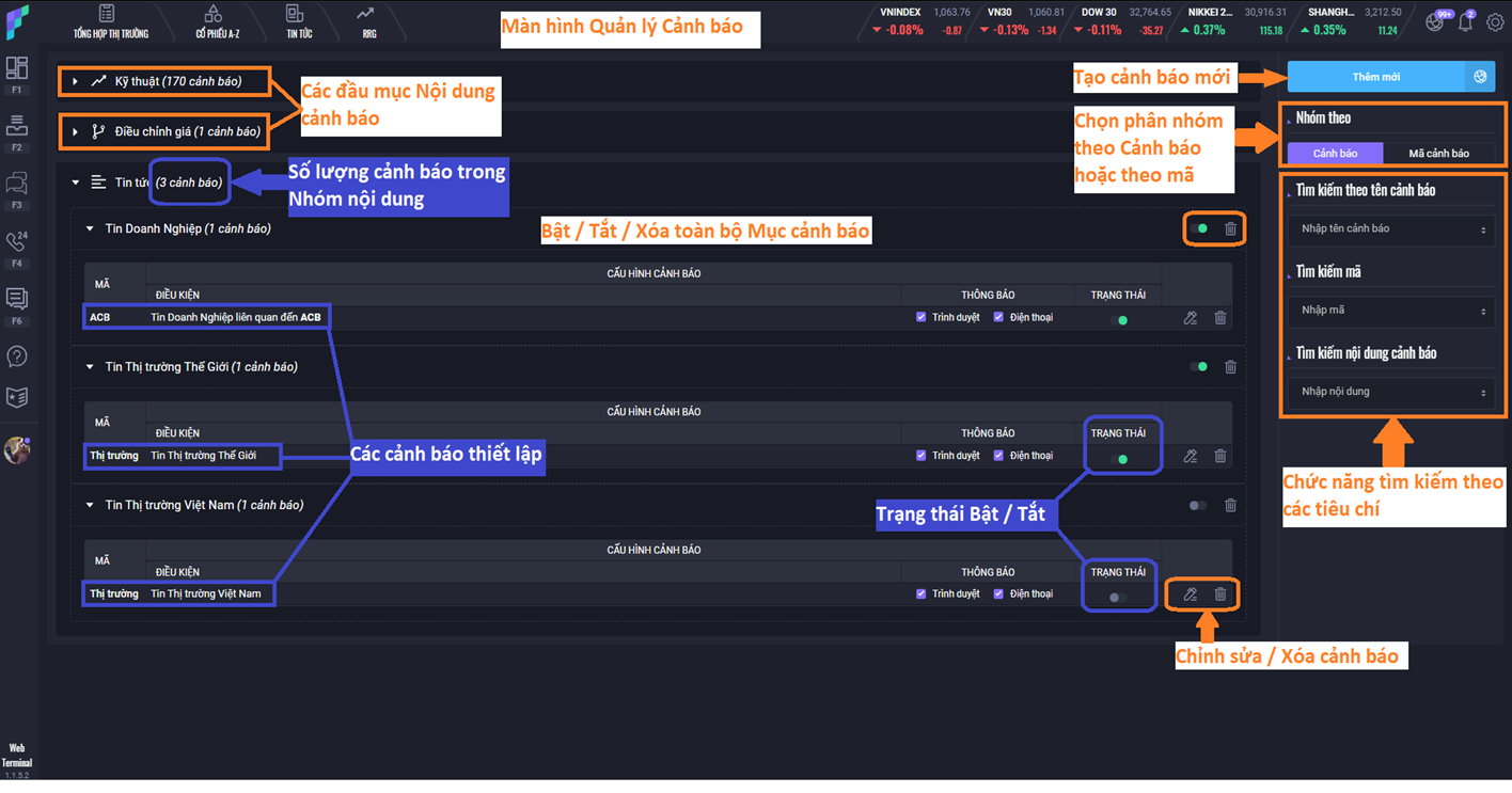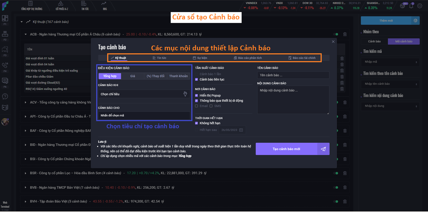 Người dùng sử dụng tính năng Cảnh báo để nhận thông báo cập nhật nhiều nội dung liên quan tới cổ phiếu, thị trường tại thời điểm khi các điều kiện thiết lập đạt yêu cầu.
