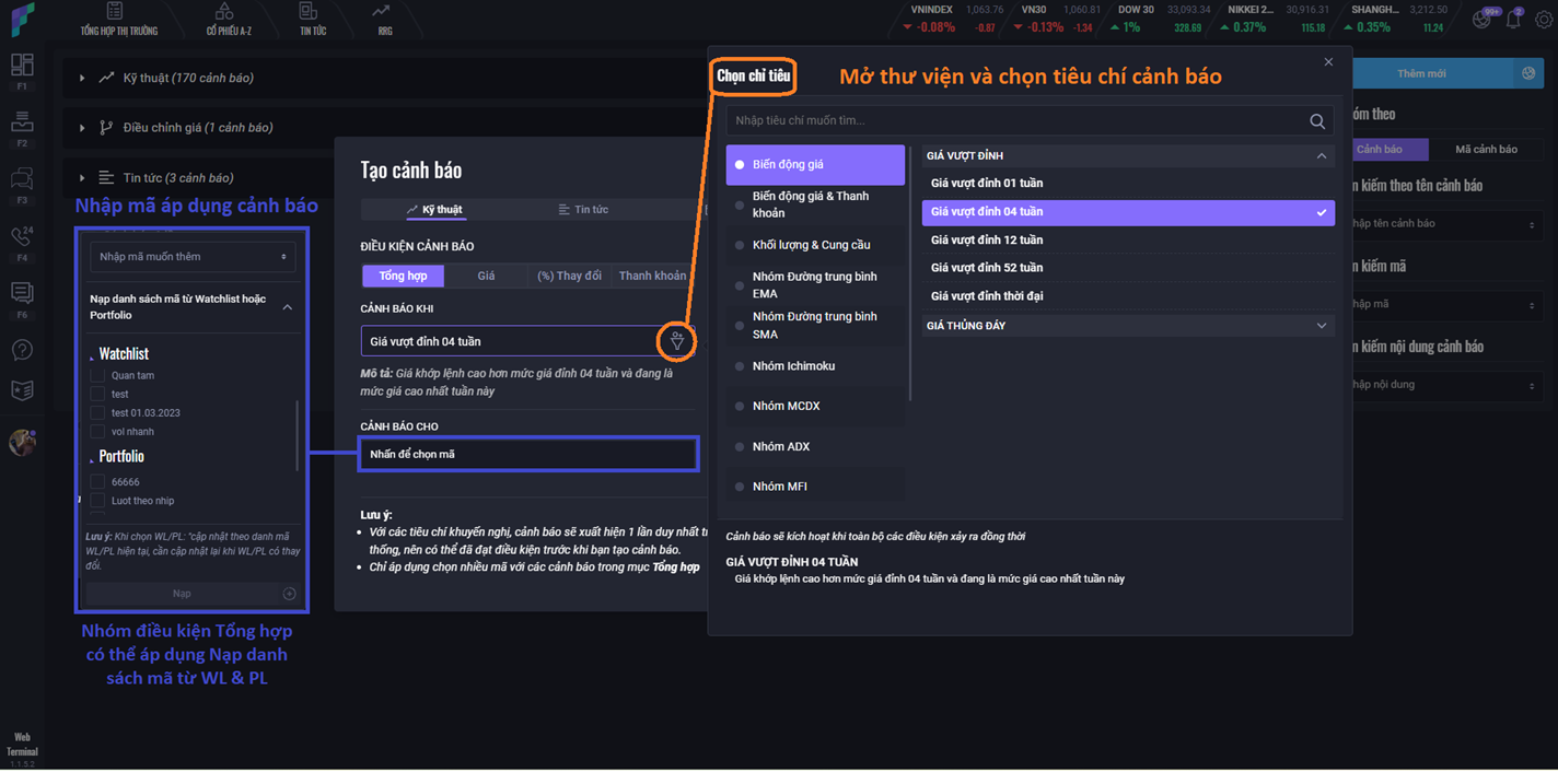 Nhập mã khi tạo cảnh báo cho từng mã, hoặc Nạp danh sách mã từ Watchlist / Portfolio.