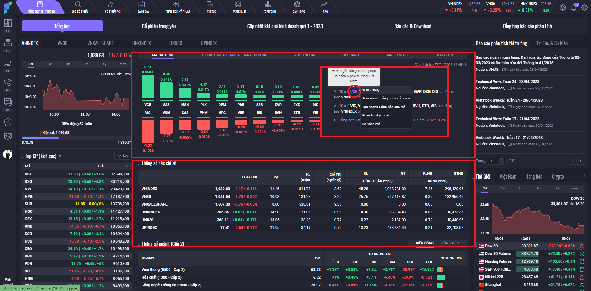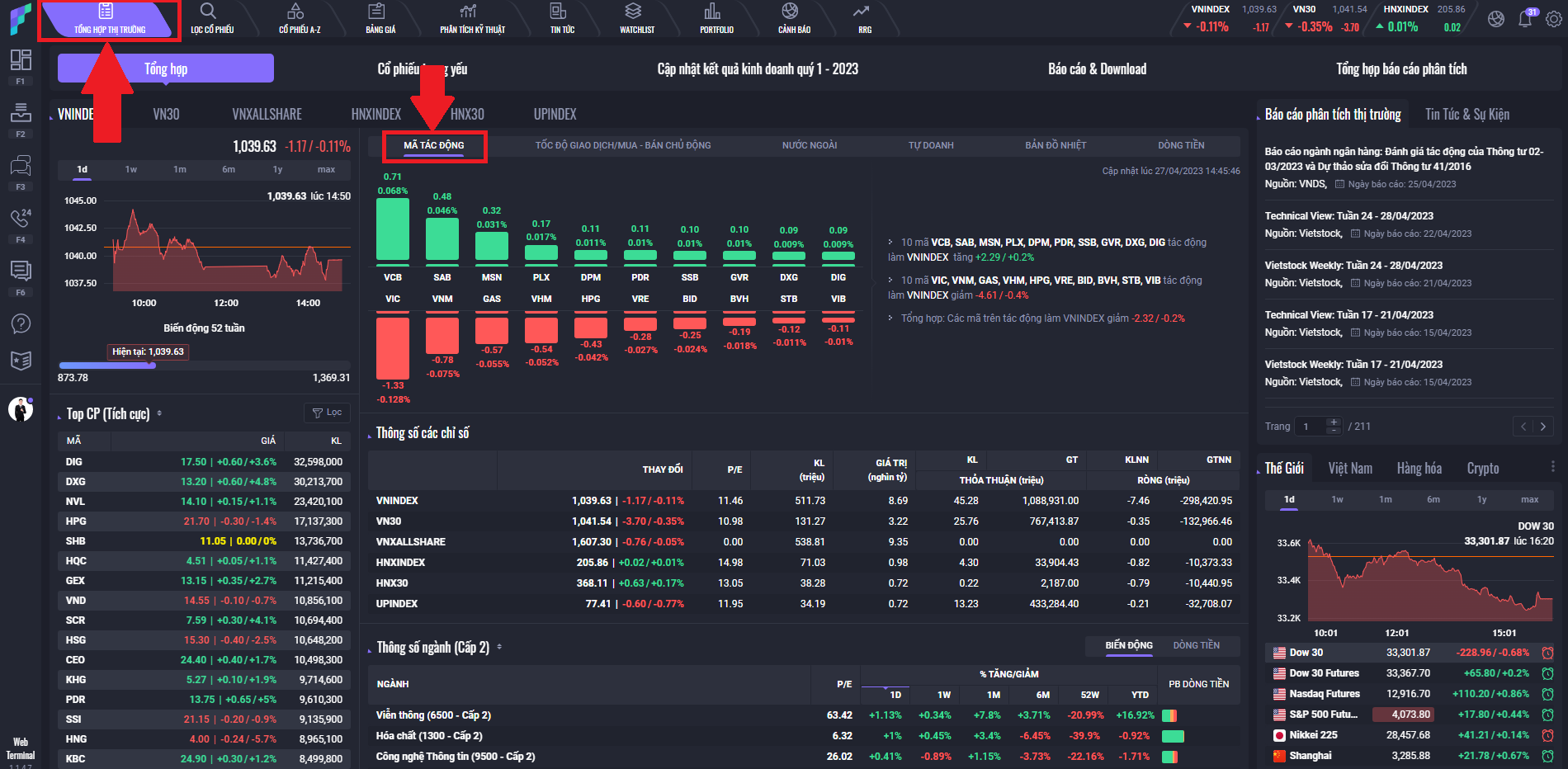Tại đây NĐT có thể xem được diễn biến các mã cổ phiếu dẫn dắt sức mạnh theo các chỉ số bao gồm các mã cổ phiếu tác động tích cực và tác động tiêu cực lên thị trường.