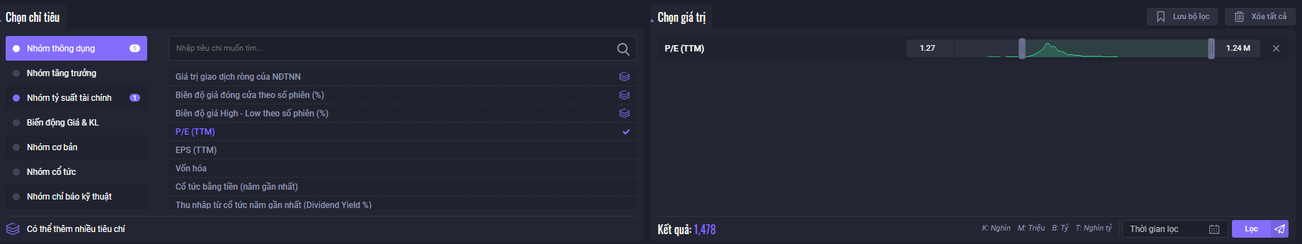 Bước 3: Tại phần tiêu chí lọc NĐT có thể lựa chọn các tiêu chí theo phân tích kỹ thuật và phân tích cơ bản để phản ánh các ý tưởng giao dịch trong bộ lọc và thiết lập các thông số cho phù hợp.