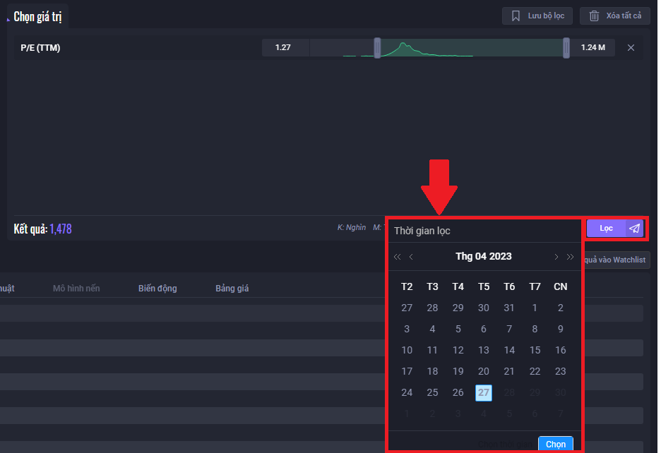 Bước 4: Chọn điều chỉnh thời gian lọc và “Lọc cổ phiếu”