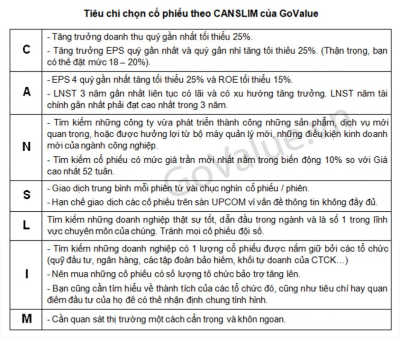 Thay vì hi vọng tìm ra một siêu cổ phiếu, mua vào và chờ tăng giá gấp 2-3 lần, phương pháp Canslim hướng đến đầu tư theo đà tăng trưởng, tìm các đoạn cổ phiếu tăng 20-30% và sẵn sàng bán thoát nếu thấy rủi ro, chấp nhận cắt lỗ ở mức 7% - 8%.