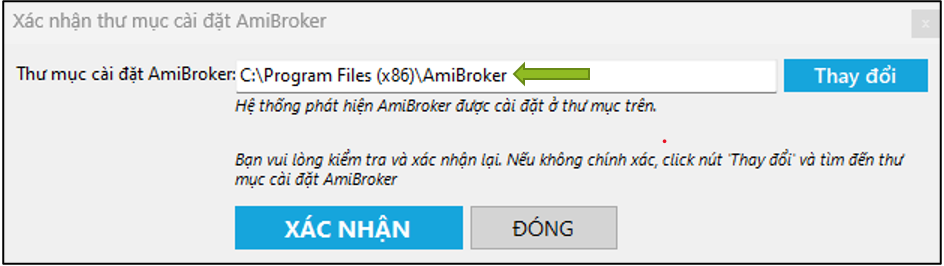 Khi cài đặt Plugin cho Amibroker, người dùng cần chọn đường dẫn tới đúng thư mục cài Amibroker (không tạo tệp riêng hay chọn các tệp nhỏ bên trong Amibroker).