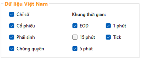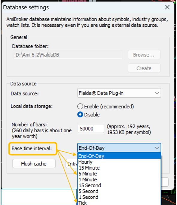 Các khung thời gian trên FData sẽ tương ứng với lựa chọn thiết lập trong phần Database settings / Base time interval của Amibroker.