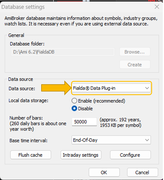 Yêu cầu bắt buộc khi thiết lập Database trên Amibroker kết nối với FData là chọn kết nối nguồn dữ liệu - Data source : Fialda Data Plug-in