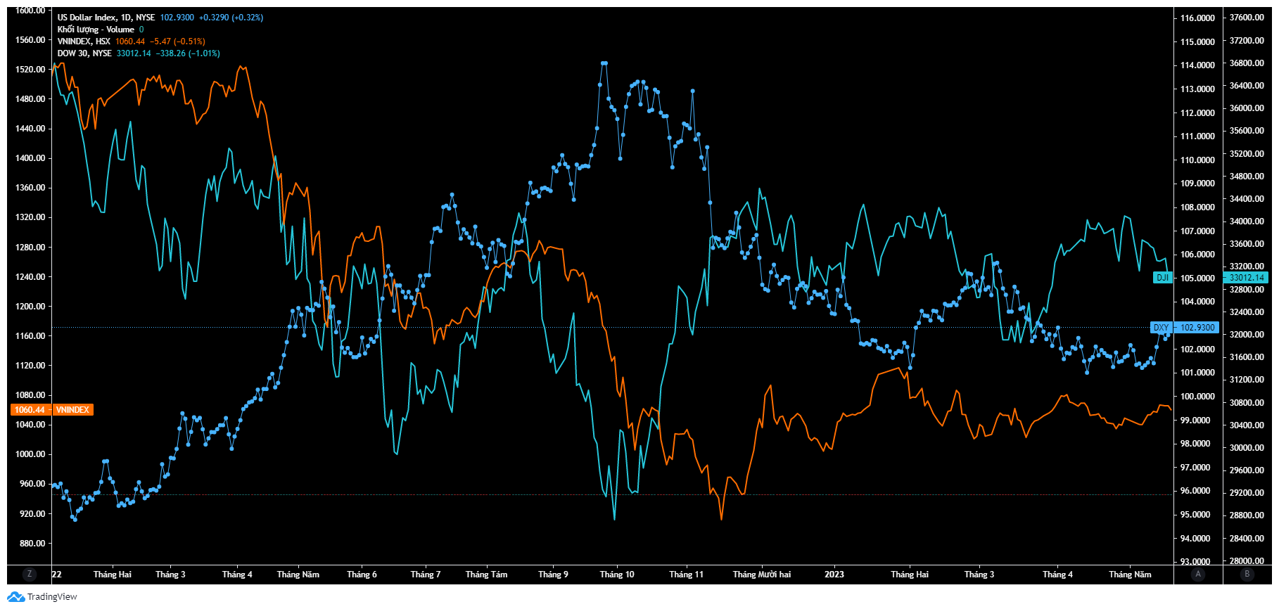 DXY là một chỉ số quan trọng trong bộ tiêu chí nghiên cứu các nhân tố tác động đến TTCK. Thực ra chỉ số DXY, hay USD Index rất phổ biến nên bạn có thể dễ dàng tra cứu ở bất cứ đâu. Giống như bất kỳ cặp tiền tệ nào, USD Index cũng có biểu đồ riêng trong đó nền tảng Fialda với sự cho phép từ nền tảng tradingview cung cấp chỉ số này hỗ trợ NĐT có cái nhìn về sức mạnh giá đồng USD trong quá trình nghiên cứu đầu tư chứng khoán.