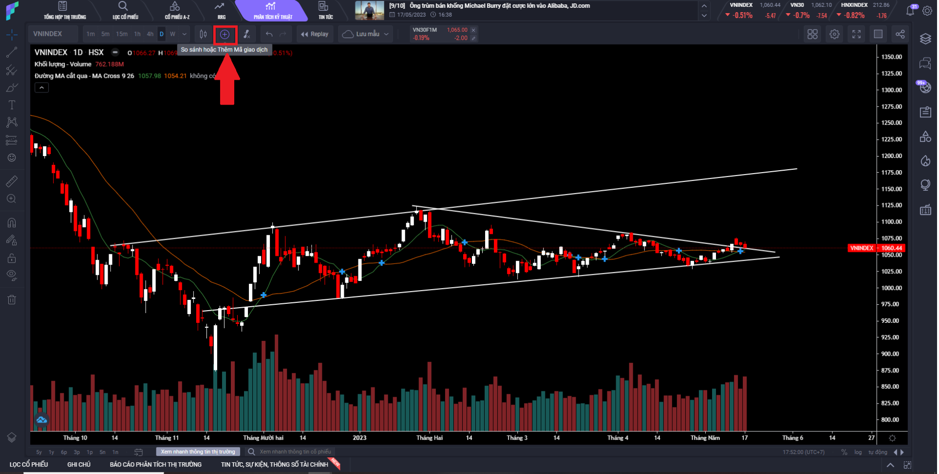 Bước 3: Chọn các cổ phiếu hoặc chỉ số mà bạn muốn so sánh tương quan. Bạn có thể nhập mã cổ phiếu hoặc chọn từ danh sách sẵn có.