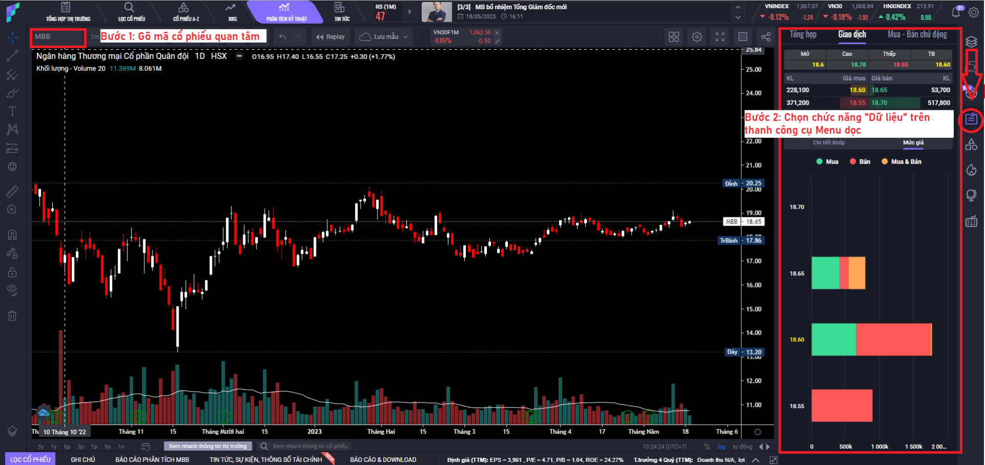 Theo dõi tình hình mua bán của nhà đầu tư: Thông tin về khối lượng mua bán, tỷ lệ mua/bán chủ động của các nhà đầu tư trên màn hình PTKT giúp bạn theo dõi tình hình mua bán của nhà