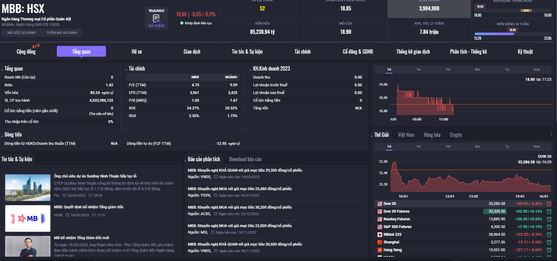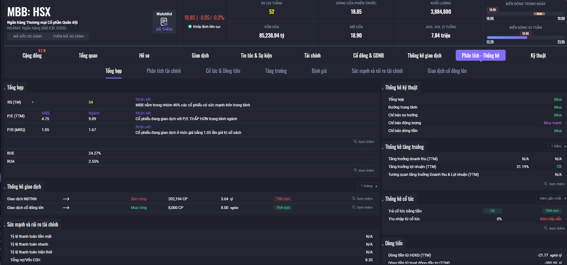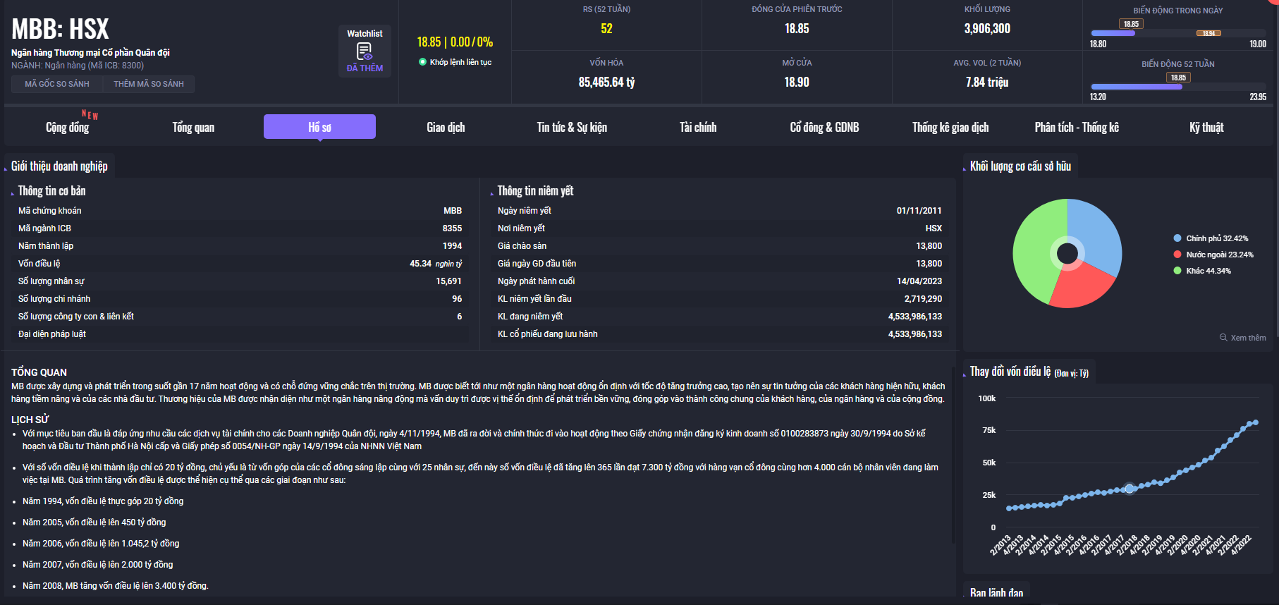Thông tin cơ bản: Tính năng Xem nhanh Chi tiết Cổ phiếu cung cấp thông tin cơ bản về cổ phiếu như giá hiện tại, biến động giá, giá trị vốn hóa, P/E, EPS, tỷ lệ cổ tức và các chỉ số tài chính quan trọng khác.