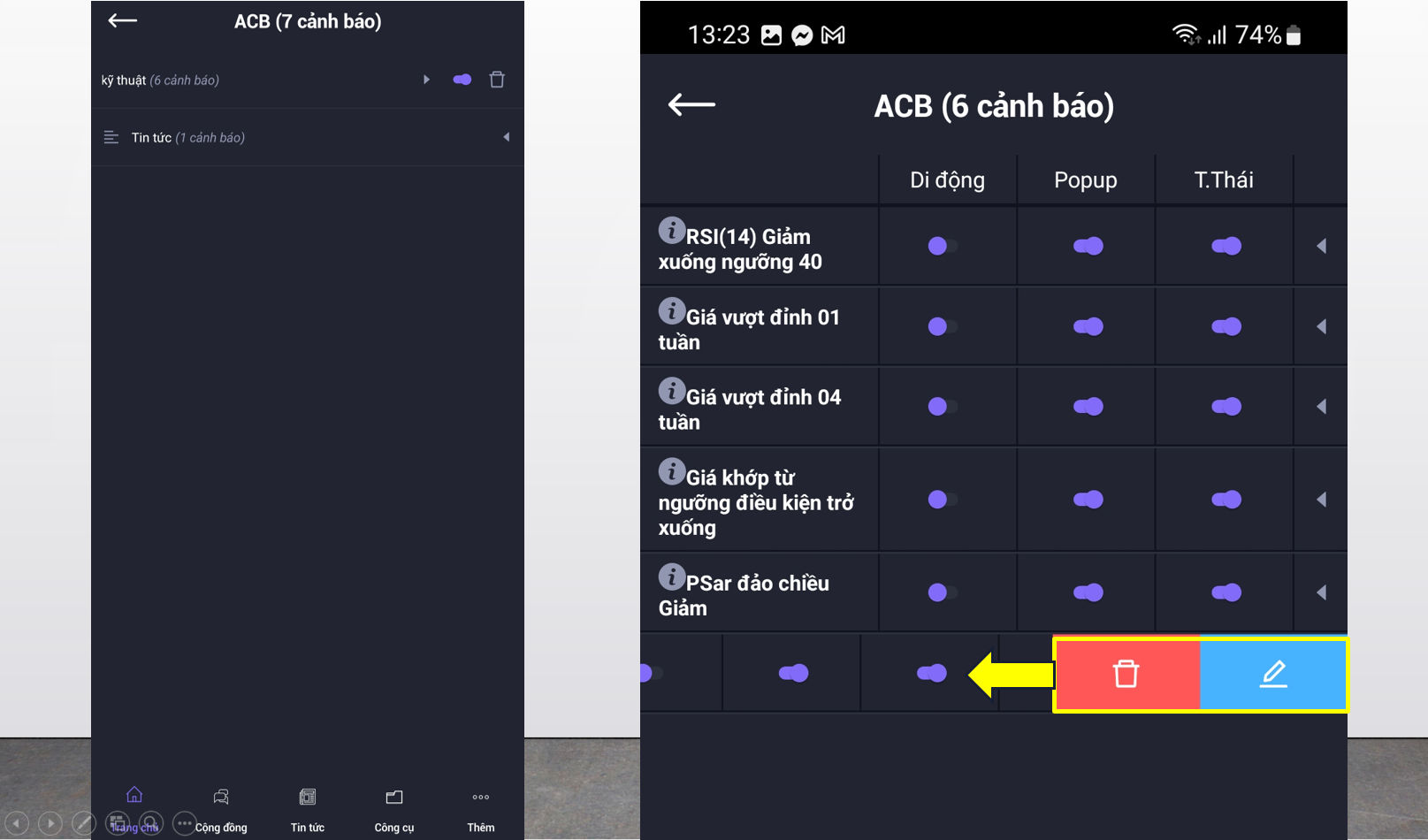 Ngoài ra, khi gạt ngang theo hướng mũi tên, người dùng có thể chọn Xóa / Chỉnh sửa Cảnh báo đã thiết lập.