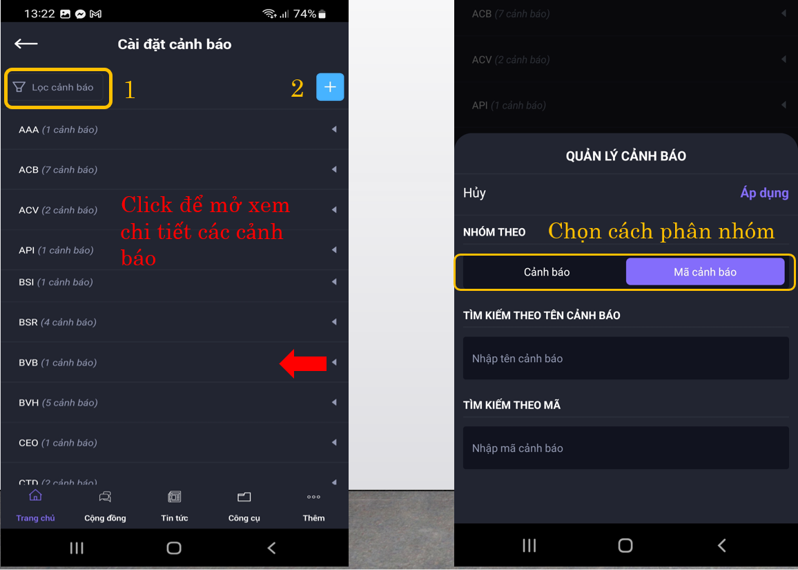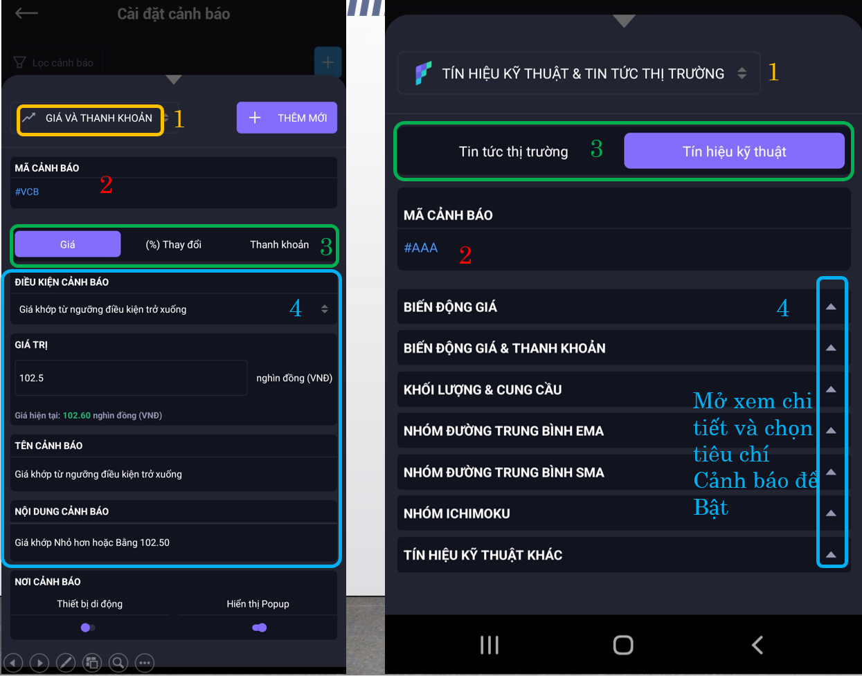 Người dùng chọn nhóm tiêu chí Cảnh báo để hiển thị nội dung thiết lập. Với nhóm Giá và Thanh khoản: người dùng cần nhập giá trị cho mỗi mã cổ phiếu khi thiết lập cảnh báo. Các nhóm tiêu chí cảnh báo khác sẽ chỉ cần nhập mã và chọn Bật / Tắt / Thêm mới để tạo Cảnh báo.