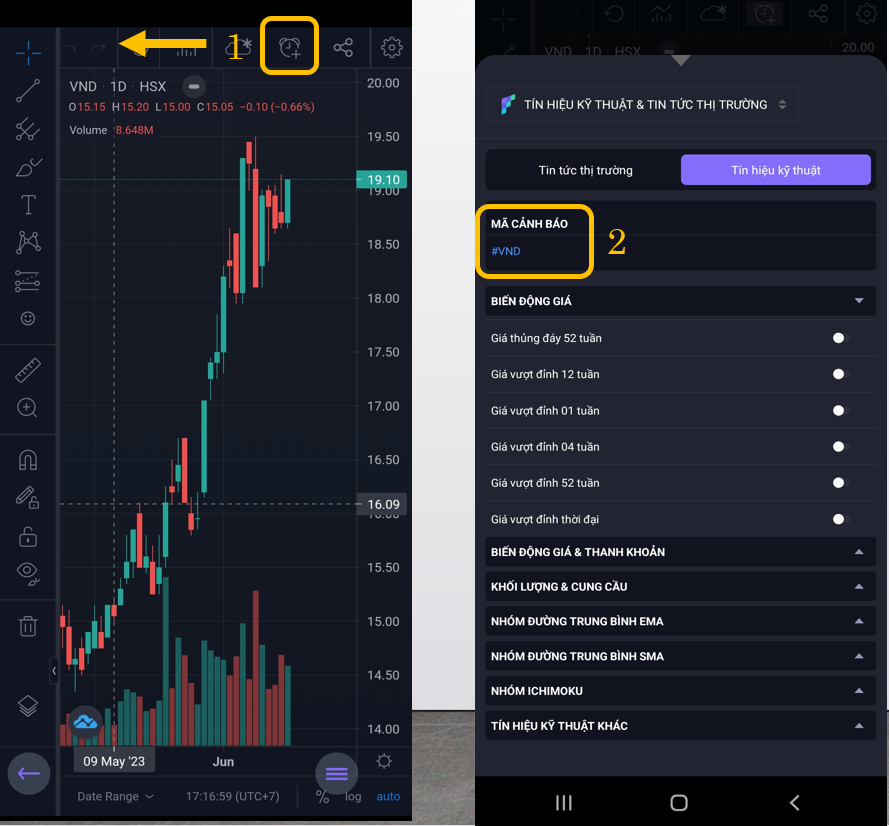 Ở màn hình Đồ thị kỹ thuật, người dùng có thể mở ngay mục Thiết lập Cảnh báo ở menu chức năng phía trên của đồ thị.