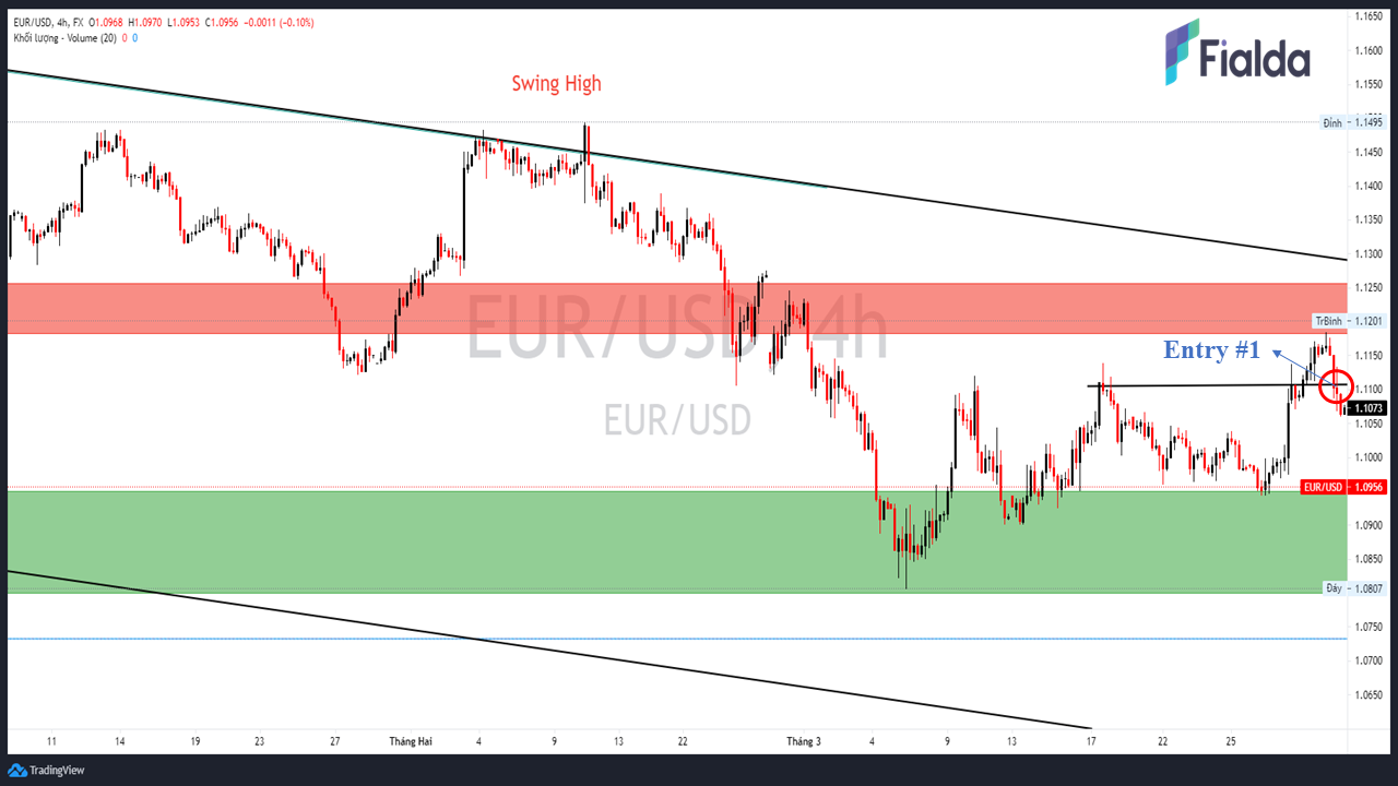 Hiện tại, xu hướng đã được xác định, sau đó, Swing trader sẽ giảm khung thời gian xuống khung bốn giờ để tìm kiếm các điểm vào lệnh. Trong ví dụ dưới đây, có một mức kháng cự giá rõ ràng mà Swing trader sẽ xem xét khi tham gia giao dịch mua. Khi giá phá vỡ hoặc nến đóng cửa trên mức kháng cự được chỉ định, các trader có thể tham gia.