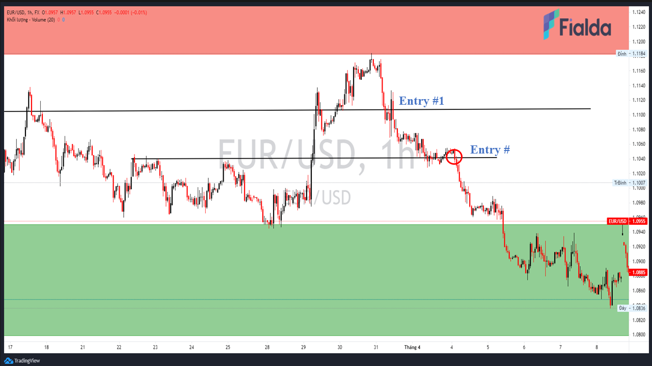 Biểu đồ tỷ giá EUR/USD khung thời gian 1H để xác định thời điểm vào lệnh.