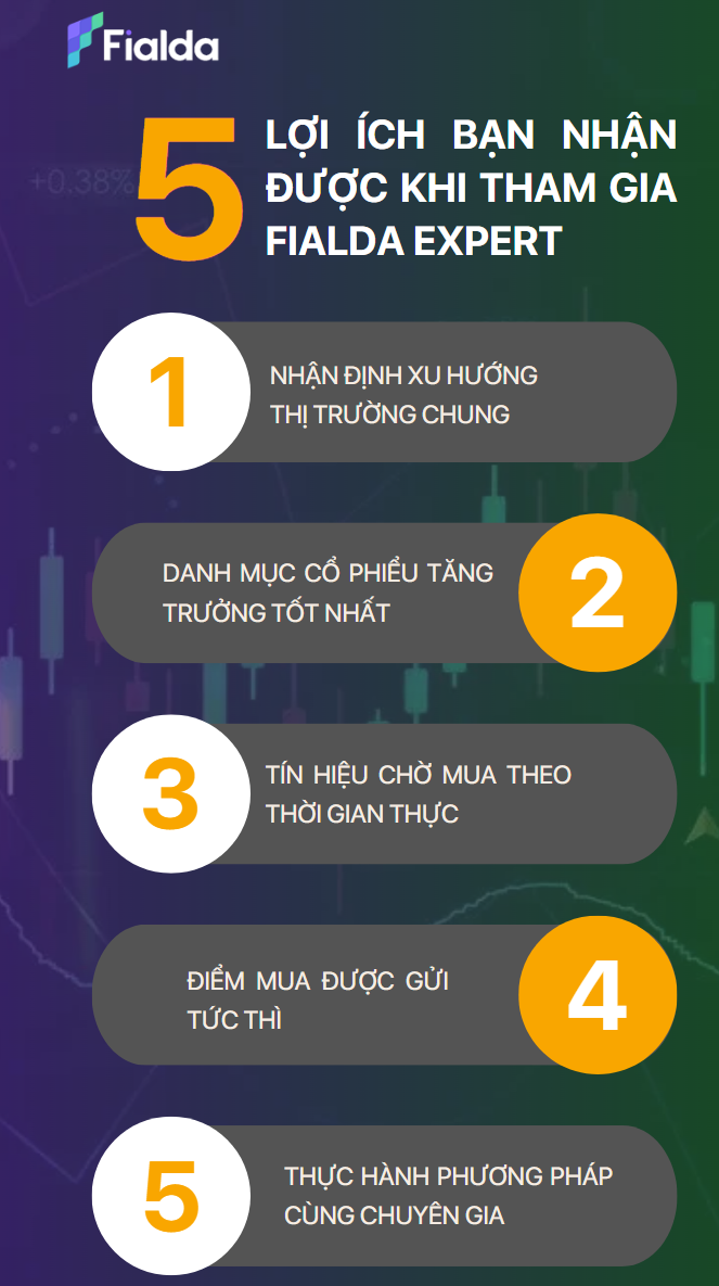 Đồng hành cùng Fialda Expert, bạn sẽ được nhận những lợi ích rất lớn. Fialda Expert sẽ mang đến cho bạn một danh sách những cổ phiếu đáng để quan tâm nhất, bên cạnh việc phân tích chuyên sâu về xu hướng thị trường. Fialda Expert còn có khả năng đưa ra gợi ý về tín hiệu và điểm mua vào cổ phiếu theo thời gian thực, giúp bạn nắm bắt những cơ hội sinh lời lý tưởng. Đội ngũ chuyên gia của Fialda Expert cũng luôn sẵn sàng đồng hành của bạn trên chặng đường đầu tư.