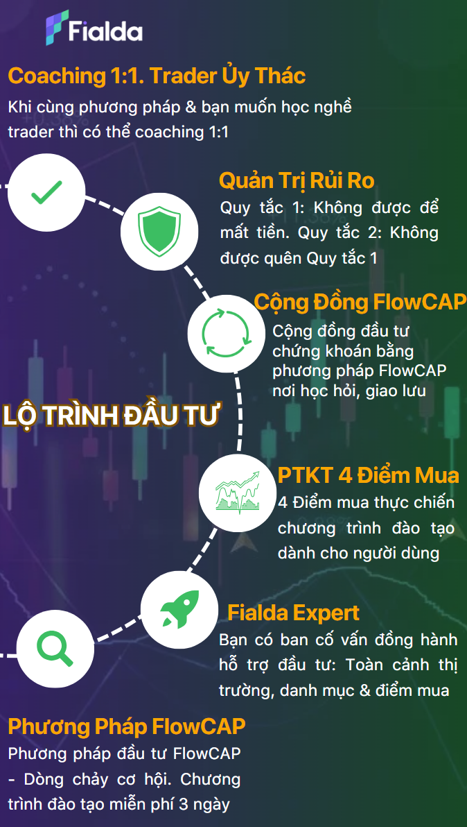Nếu bạn muốn tiến xa trong trading và có mong muốn trở thành trader chuyên nghiệp, Fialda cũng sẵn sàng đồng hành cùng bạn. Chương trình Coaching 1:1 - Trader Ủy Thác của Fialda Expert sẽ cùng bạn đặt những nền tảng đầu tiên cho sự nghiệp Trader xán lạn của bạn bằng phương pháp FlowCAP, phương pháp đầu tư theo dòng chảy cơ hội; bắt đầu bằng 3 buổi học HOÀN TOÀN MIỄN PHÍ cùng chuyên gia của Fialda Expert.