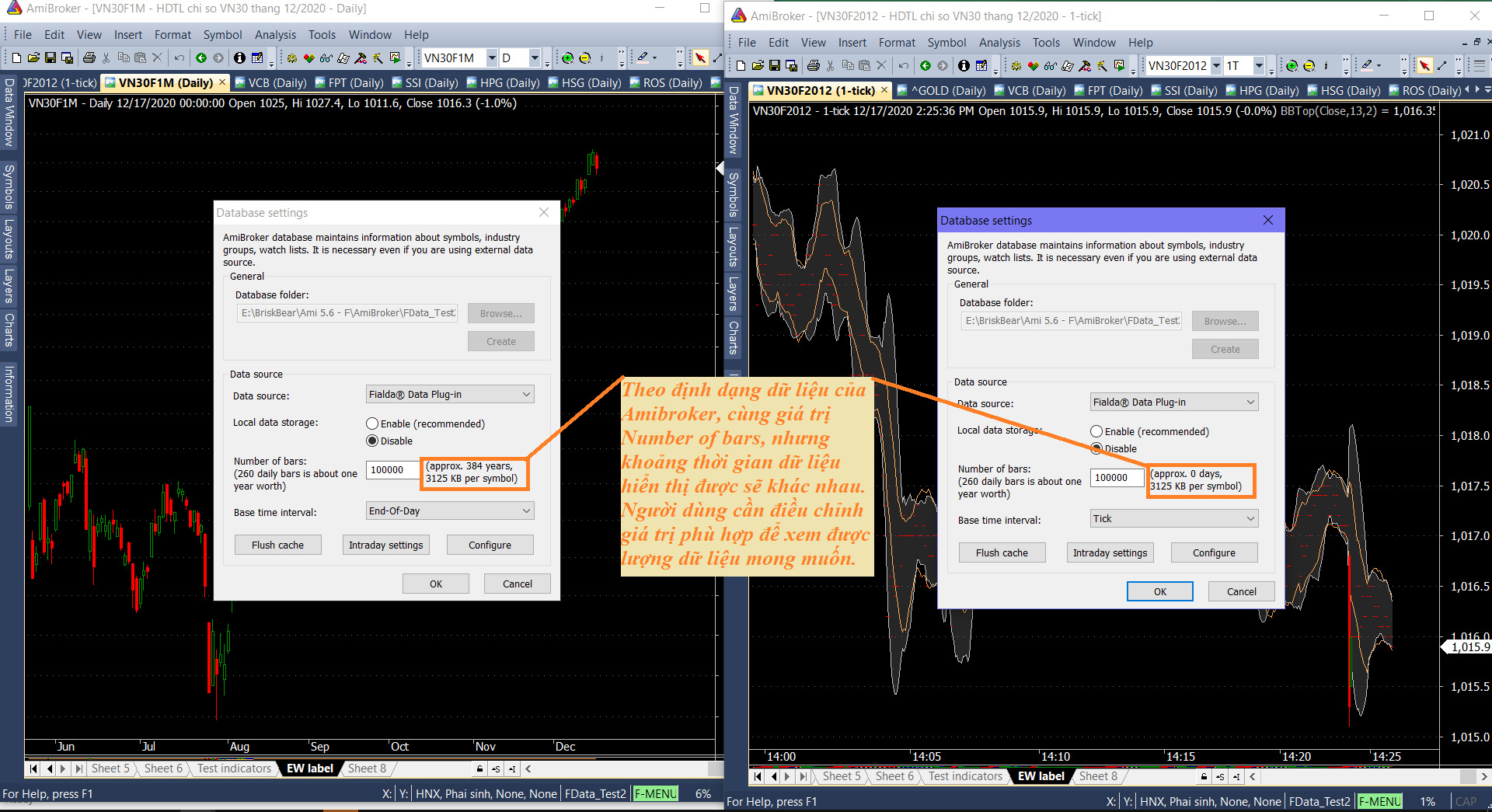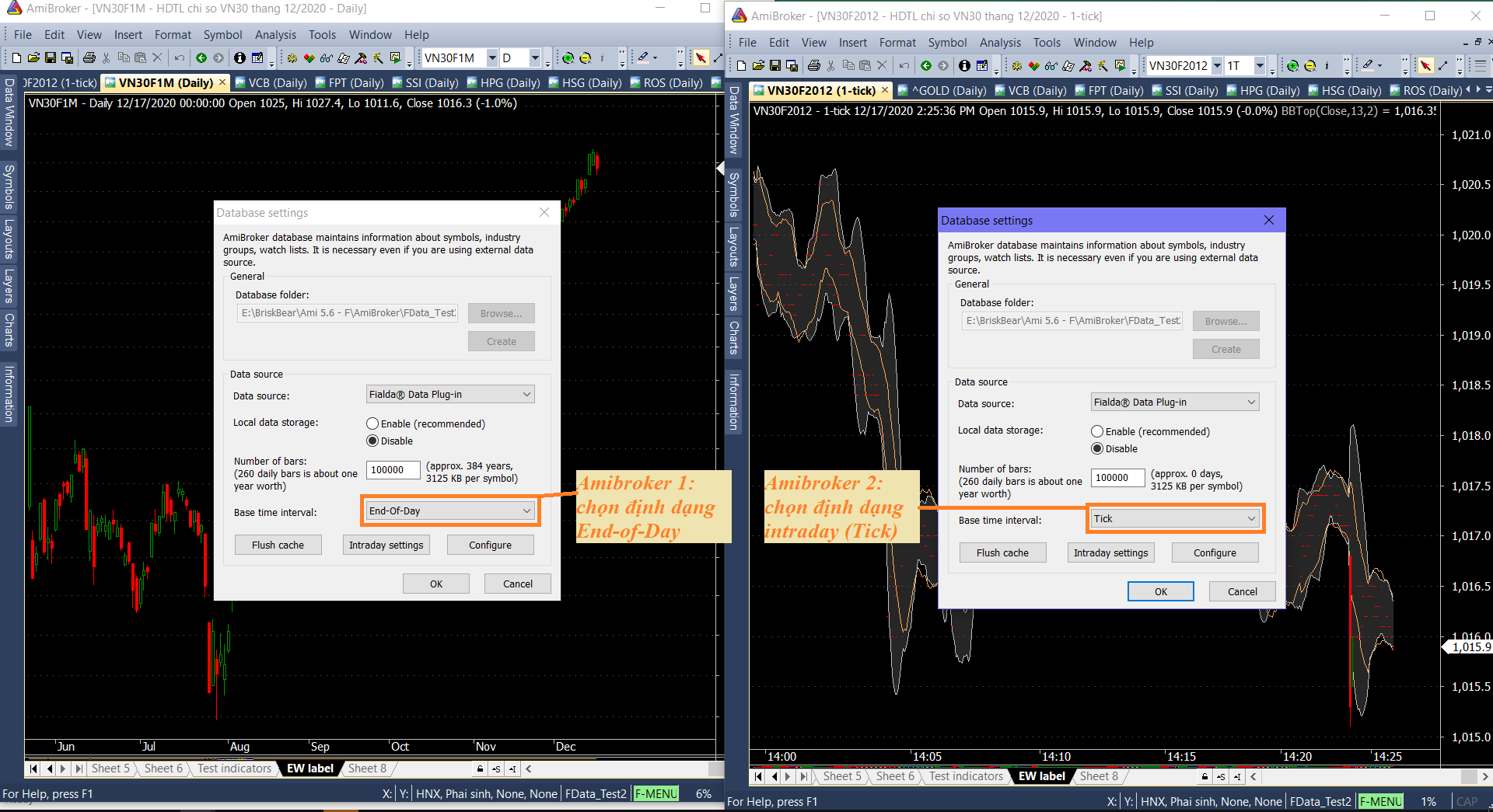 Khi đã thiết lập kết nối dữ liệu với Fdata, người dùng có thể mở Amibroker 2 lần, để có 2 cửa sổ Amibroker. Trên mỗi cửa sổ Amibroker đang chạy, bạn sẽ thiết lập định dạng dữ liệu trong: File / Database settings / Base time interval là dữ liệu End-of-day và intraday khác nhau.