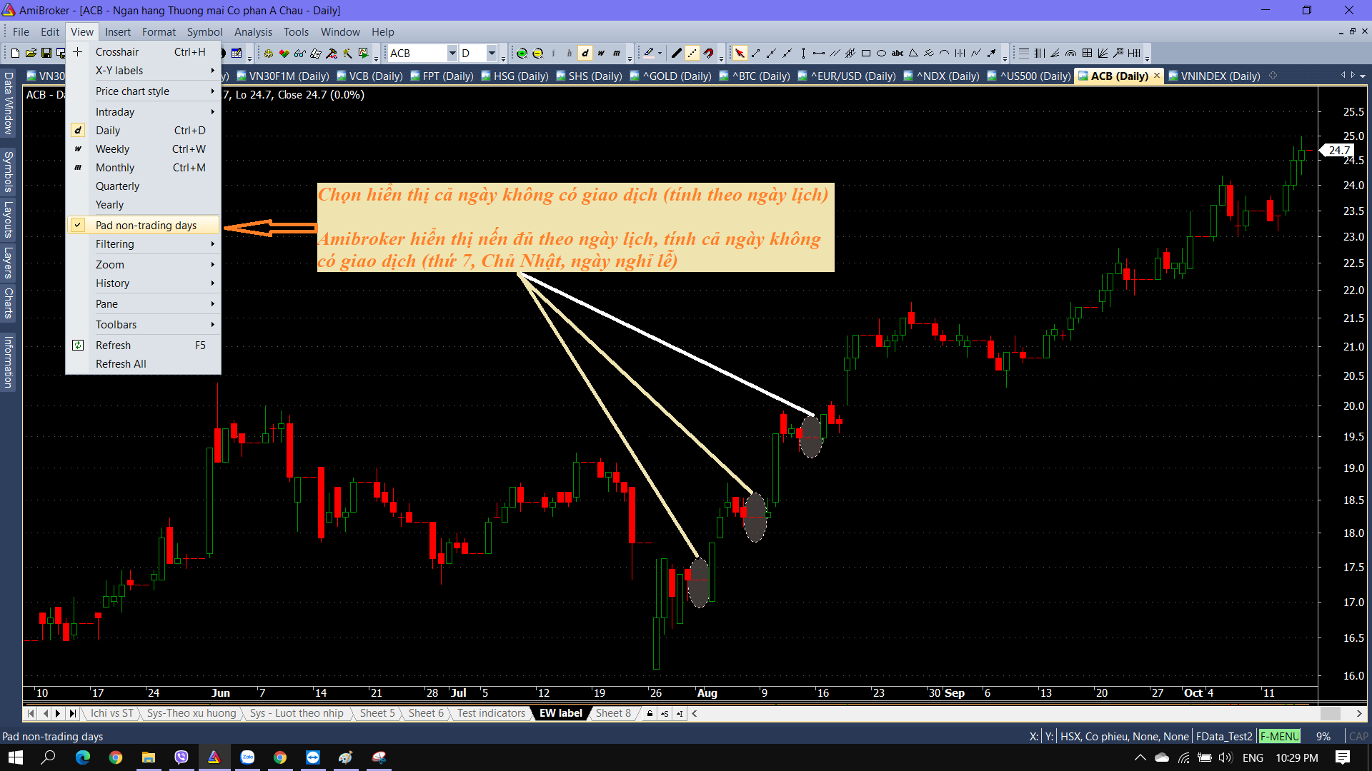 Người dùng cần kiểm tra lại trên Amibroker: File / View / Pad non-trading days.