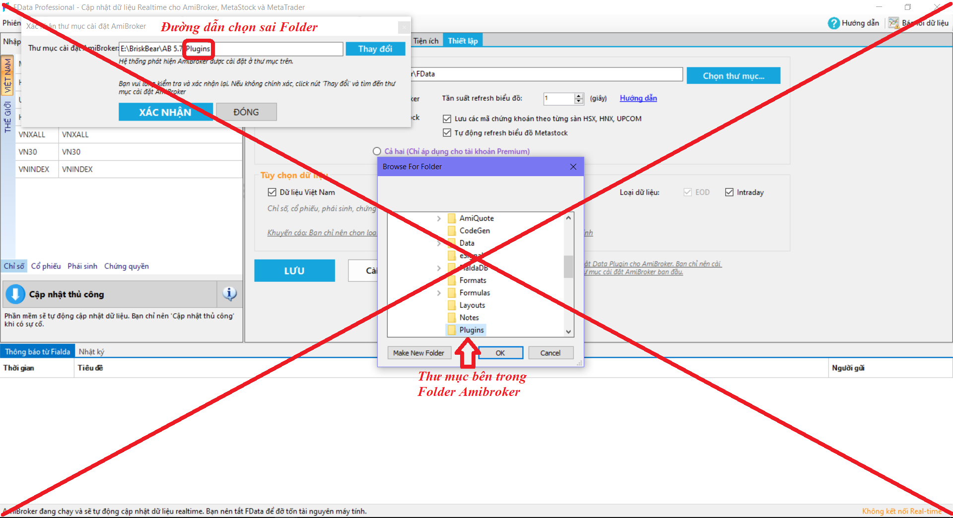 Bạn cần chọn đường dẫn tới đúng Folder cài Amibroker đang sử dụng (Ví dụ: E:\Amibroker), và KHÔNG CHỌN các folder khác bên trong folder cài Amibroker.
