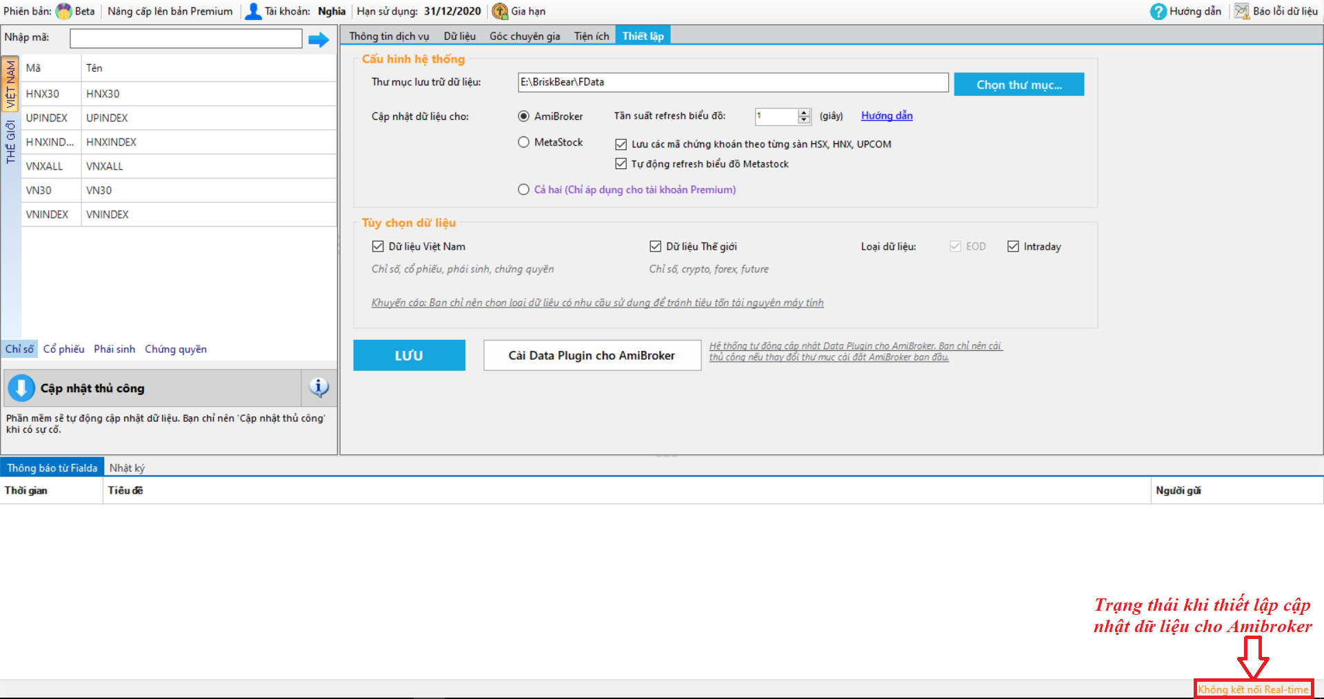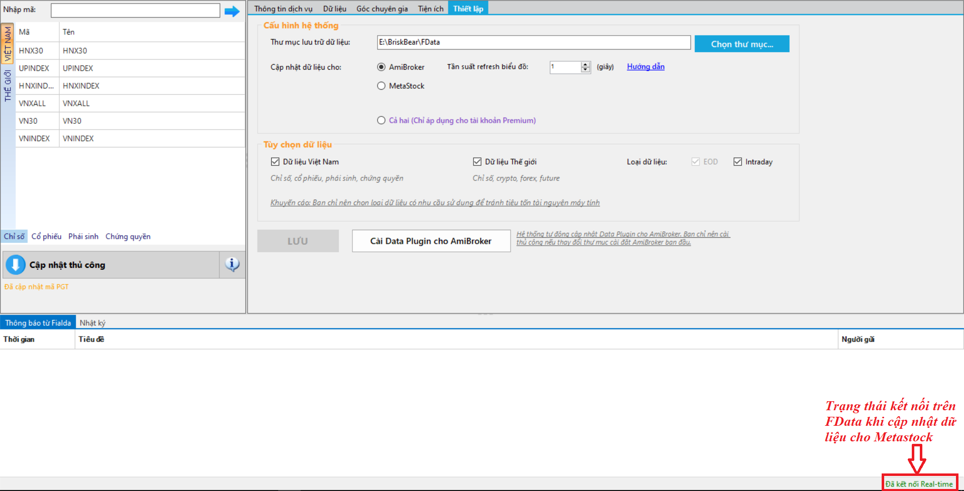 Nếu thiết lập cập nhật dữ liệu cho Metastock, bạn sẽ cần bật FData song song với Metastock, và khi đó FData sẽ báo trạng thái "Đã kết nối Real-time".