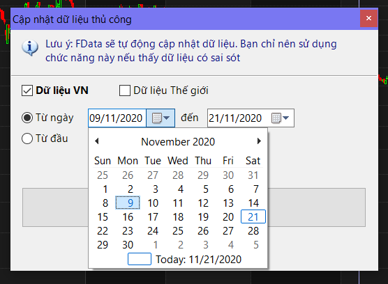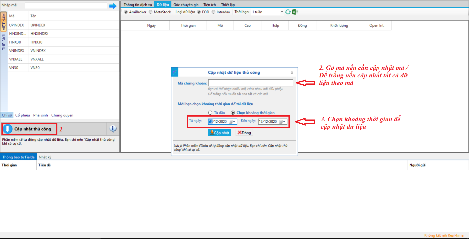 Ngoài ra, các thao tác cập nhật dữ liệu cho MetaStock (trong trường hợp dữ liệu bị lỗi, hoặc cần cập nhật danh sách mã mới) cũng cần thực hiện trên FData (phần cập nhật thủ công).