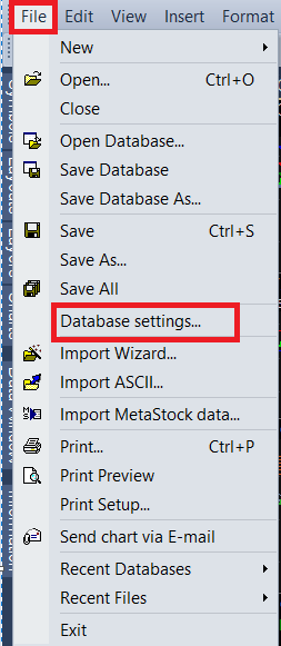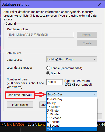 - Vào File / Database settings / Base time interval => chọn Tick / 1 minutes (đơn vị thời gian nhỏ nhất muốn thiết lập trên đồ thị định dạng intraday)